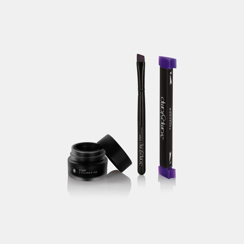 Wing woes are a thing of the past with this innovative stamp tool from The Vamp Stamp. Specially designed to give you the perfect vampy winged liner with no muss + no fuss. To use, dip Vamp Stamp into your favorite liquid or gel liner, ensuring stamp is fully coated. Align to the outer corner of your eye and press on in a quick stamping motion to avoid smears or smudges. Use eyeliner to develop line as desired on lid before switching to the other side.